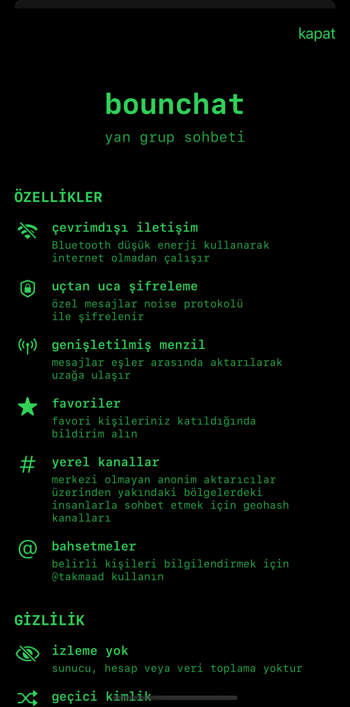 * Herkese açık gönderiler: Geohash kanal gönderilerinin herkese açık olduğunu ve üçüncü taraf aktarıcılar tarafından saklanabileceğini unutmayın./Çocukların gizliliğibounchat, 13 yaş altındaki (veya bulunduğunuz bölgedeki asgari yaş sınırının altındaki) çocuklara yönelik değildir. Çocukların kişisel verilerini bilerek toplamıyoruz./GüvenlikAnahtarlar iOS Keychain’de saklanır. Mesh DM’leri Noise şifrelemesiyle, Nostr DM’leri standart Nostr şifrelemesiyle korunur. Hiçbir güvenlik sistemi kusursuz değildir; hassas bilgiler paylaşırken dikkatli olun./Uluslararası aktarımlarSunucular işletmiyoruz ve verilerinizi kendi altyapımıza aktarmıyoruz. Ancak herkese açık aktarıcılara gönderi yaparsanız, içeriğiniz bu üçüncü taraflarca küresel olarak saklanabilir ve sunulabilir./Bu politikanın değişiklikleriBu politikayı açıklık veya yasal nedenlerle güncelleyebiliriz. Önemli değişiklikler “Son güncelleme” tarihinde yansıtılacaktır.