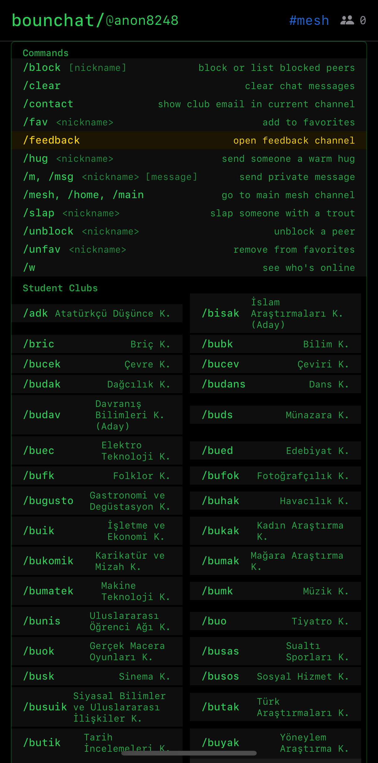 /MATRIX 'TEN DIŞARI ÇIK NEO!Bounchat, Boğaziçi Üniversitesi öğrencileri için ÖZEL tasarlanmış gizlilik-öncelikli , uçtan uca şifreli, internet veya herhangi bir telekom altyapısı gerektirmeyen bir kampüs mesajlaşma uygulamasıdır.